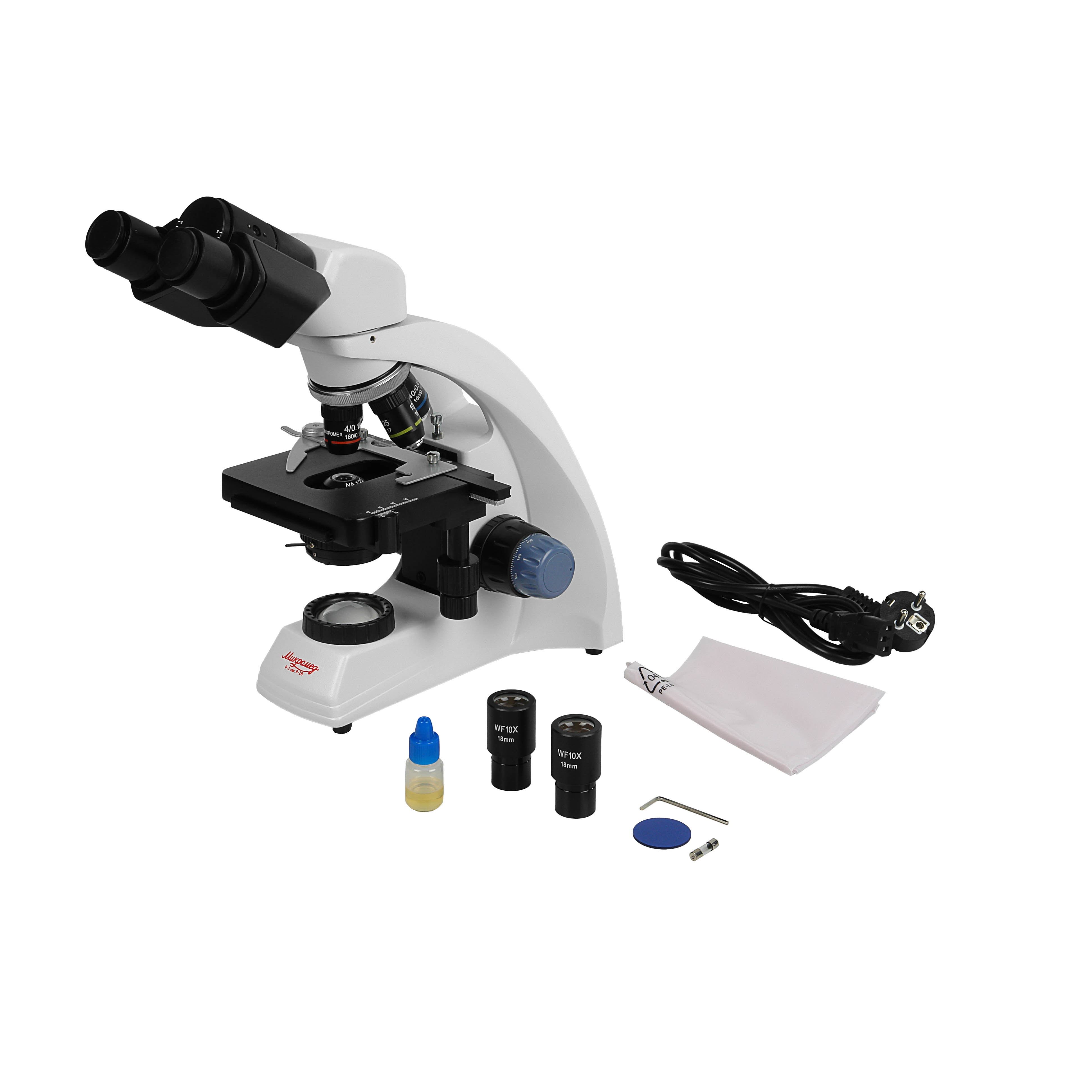 В комплекте микроскопа объективы 4х/0.10, 10х/0.25, 40х/0.65 и 100х/1.25 oil для исследования с масляной иммерсией. В комплект входят окуляры широкого поля WF 10х/18 с вынесенным зрачком, что позволяет проводить исследования как в очках, так и без них. Посадочный диаметр окуляров – 23.2 мм. Увеличение микроскопа в стандартной комплектации от 40х до 1000х. Дополнительно микроскоп может быть укомплектован окулярами WF 5х/18 мм, WF 16х/15 мм, WF 12.5х/15, WF 20х/11 и окуляром WF 10х/18 мм со шкалой / сеткой. С дополнительными окулярами увеличение микроскопа от 20х до 2000х. Также для микроскопа доступны объективы 20x/0.45 и 60x/0.80.