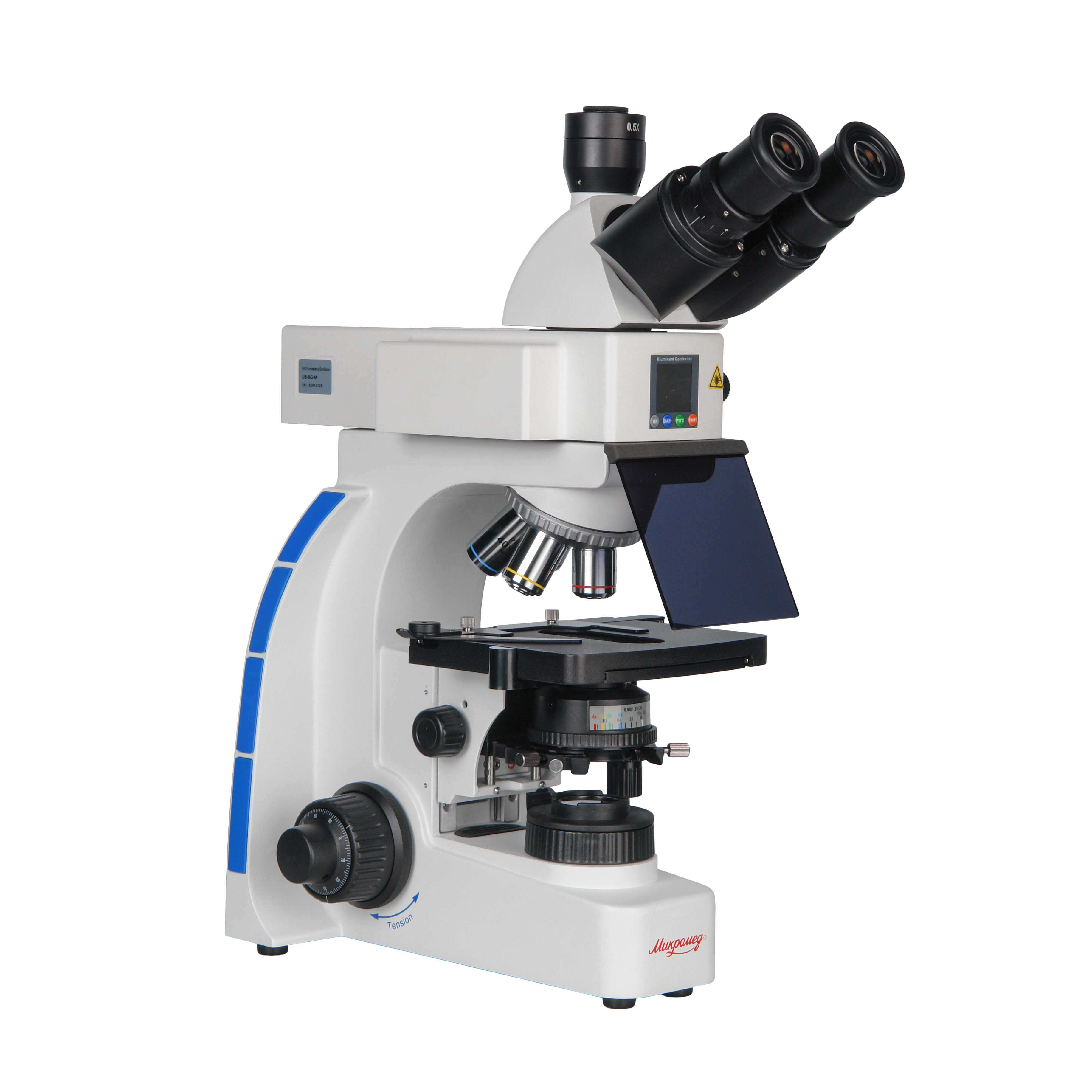 Для исследований в состав микроскопа входит люминесцентный осветительный модуль с прямым освещением предмета через объектив. Модуль имеет два люминесцентных блока, каждый из которых включает дихроичное зеркало и светофильтры. Эти элементы с высокой точностью рассчитаны для синего и зеленого спектрального диапазона. Установка необходимого спектрального диапазона осуществляется регулятором с подвижным штоком. Регулятор имеет три положения – «0», «B» и «G», соответствующие свободному отверстию, синему и зеленому цвету возбуждения.