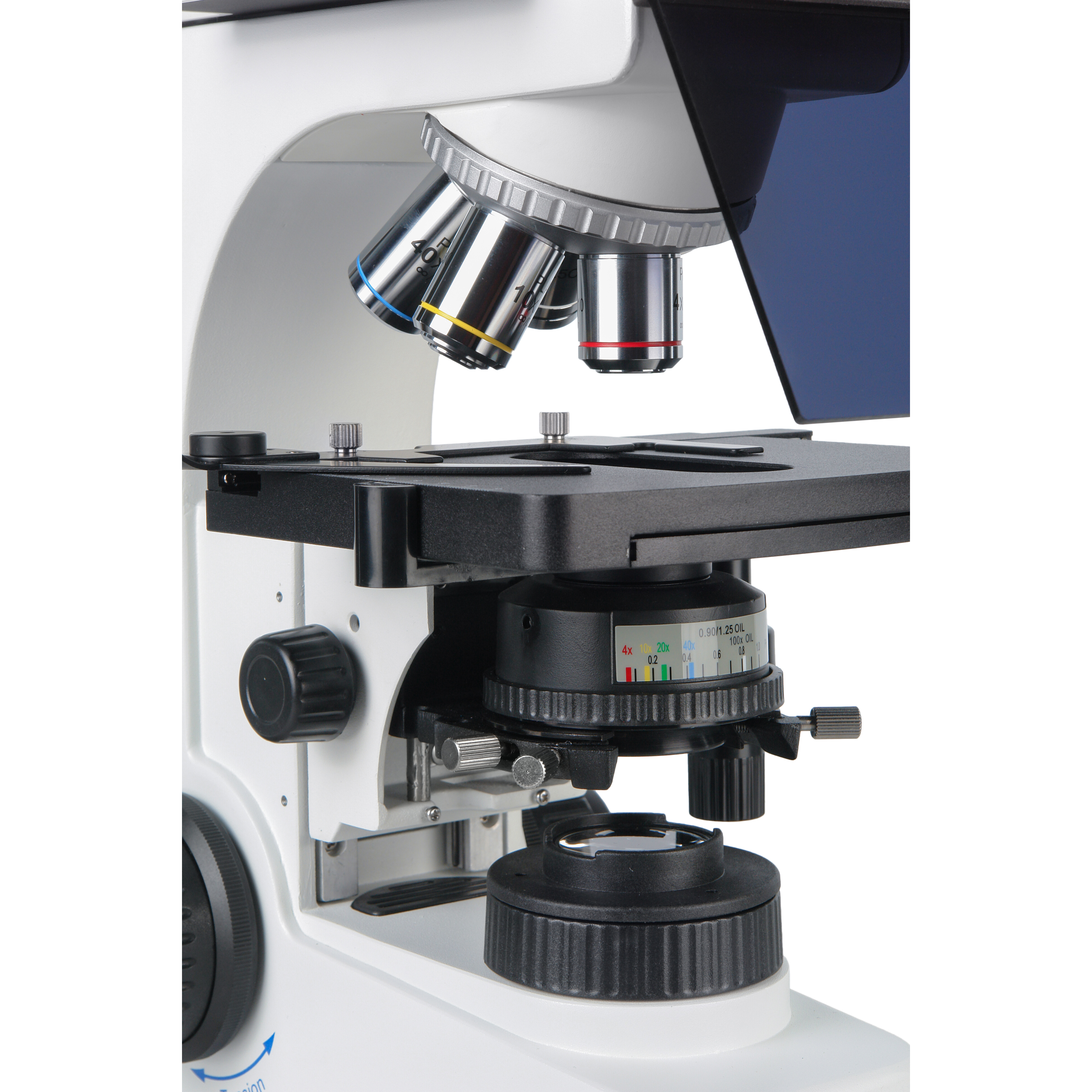 Объективы микроскопа установлены на револьверном устройстве, рассчитанном на 5 объективов. На все оптические детали микроскопа нанесено многослойное антирефлексное покрытие поверхностей. Антигрибковое покрытие оптики позволяет без ограничений использовать микроскоп в биологических лабораториях.