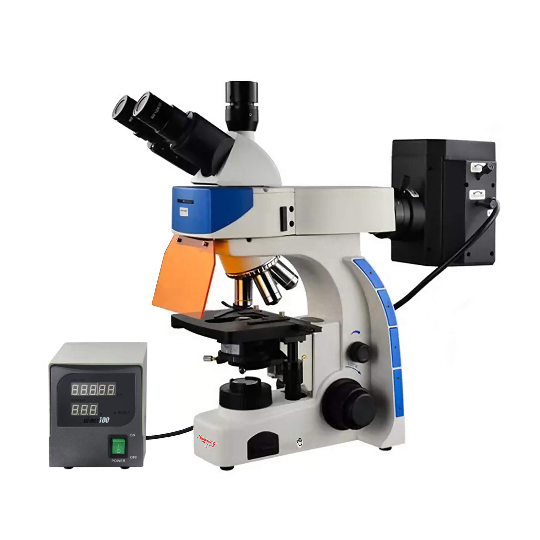 - Насадка флюоресцентная с фонарем ртутной лампы, c синим и зеленым фильтрами возбуждения, блоком питания и кабелями питания.