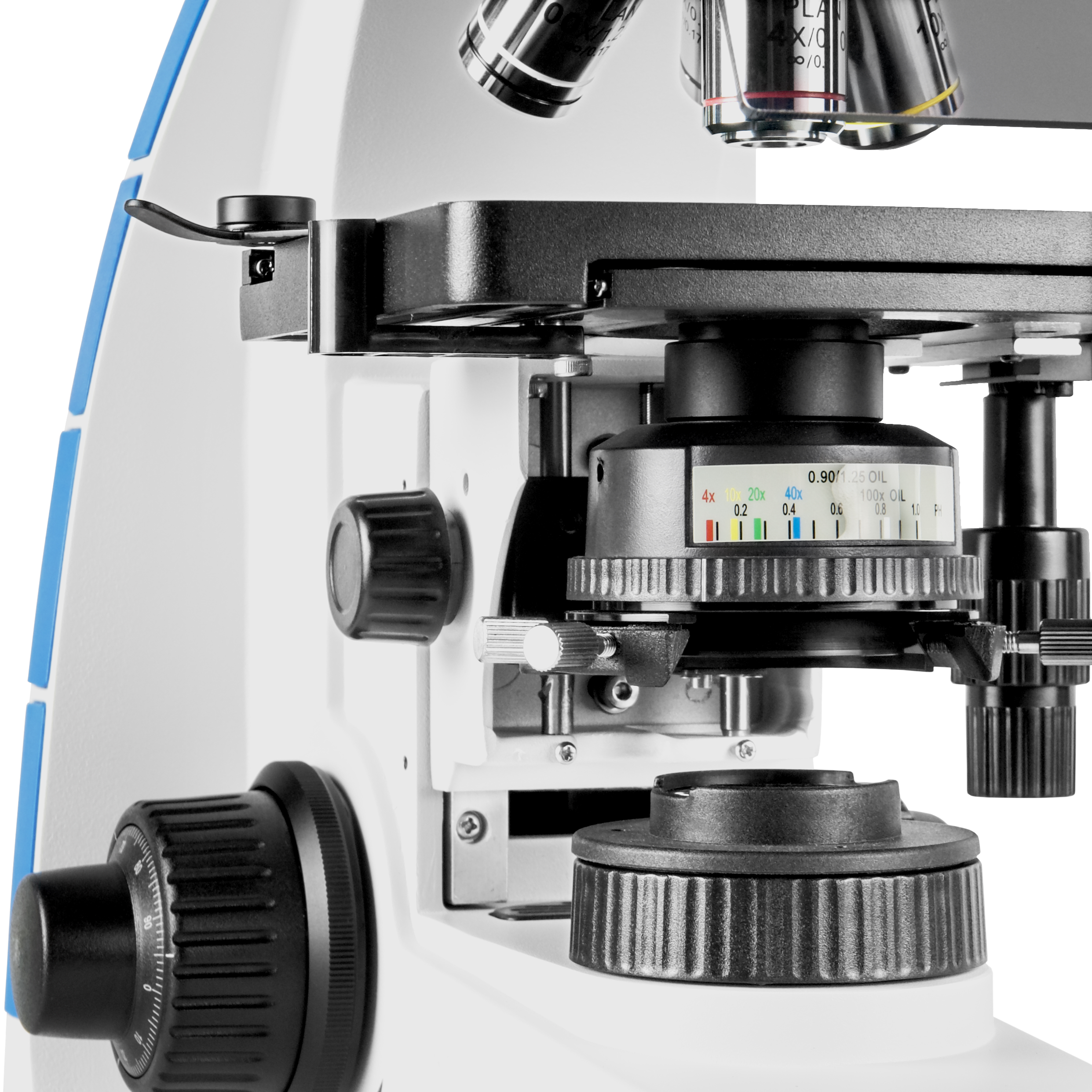 Объективы микроскопа установлены на револьверном устройстве, рассчитанном на 5 объективов. Все оптические детали имеют многослойное антирефлексное покрытие поверхностей. Антигрибковое покрытие оптики позволяет без ограничений использовать микроскоп в биологических лабораториях.