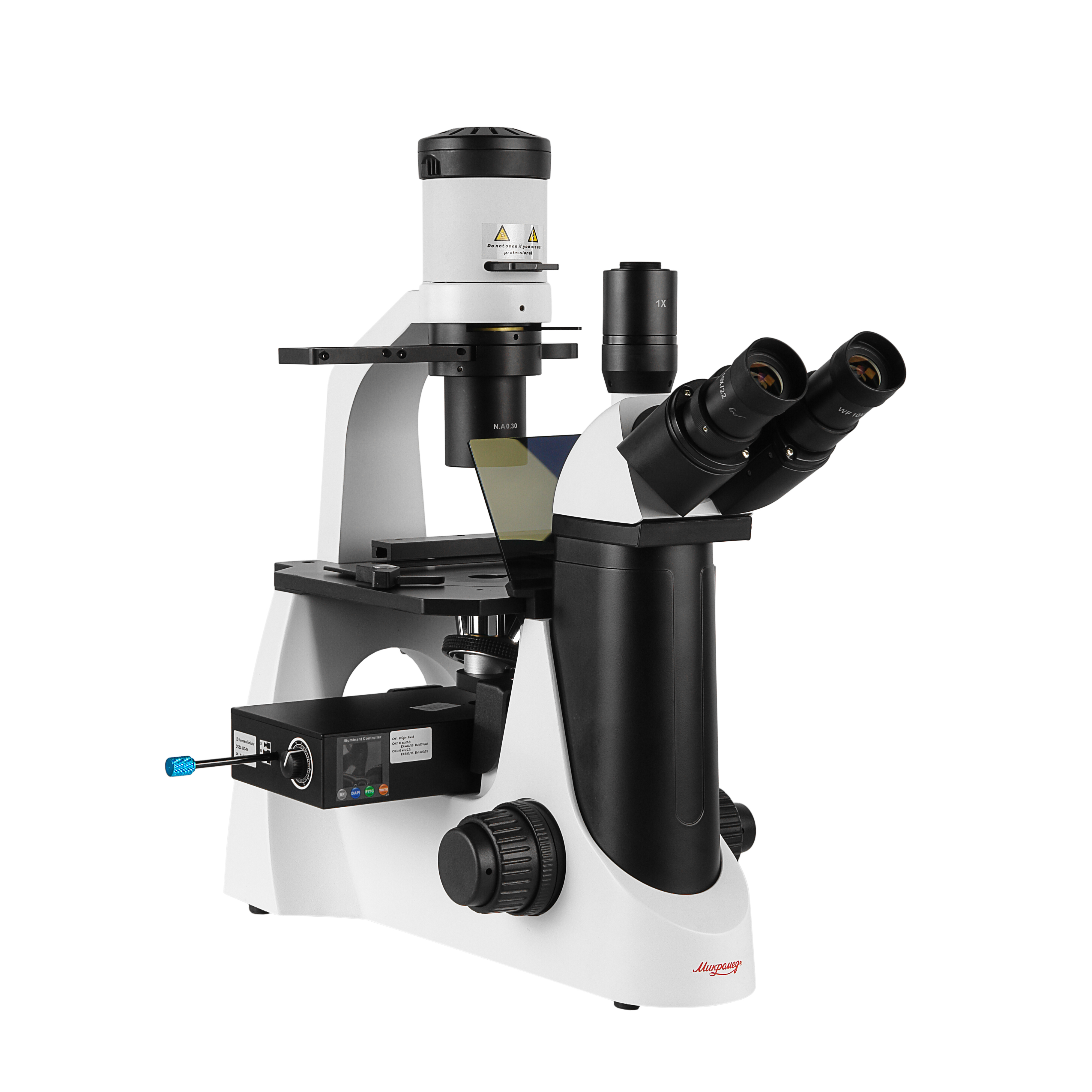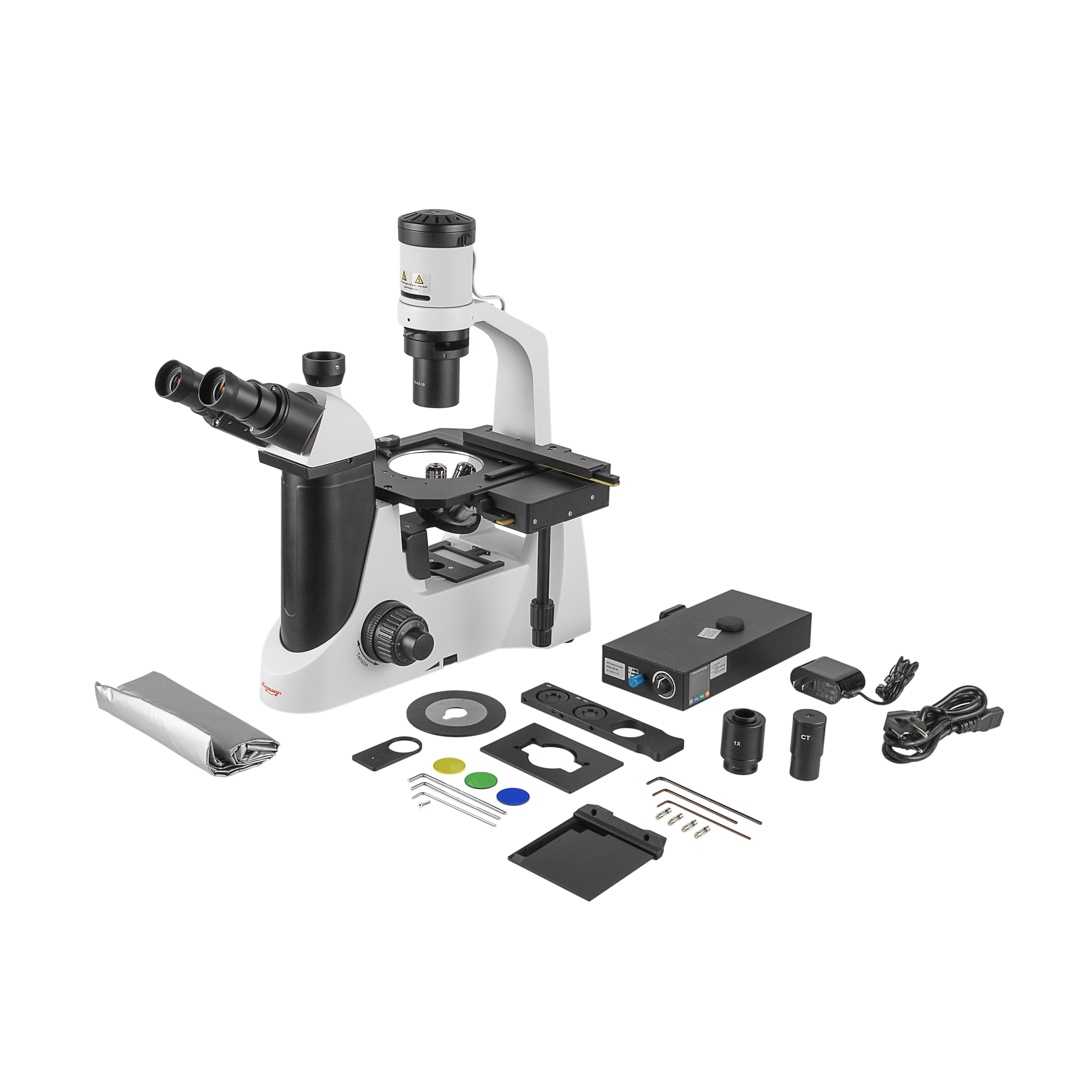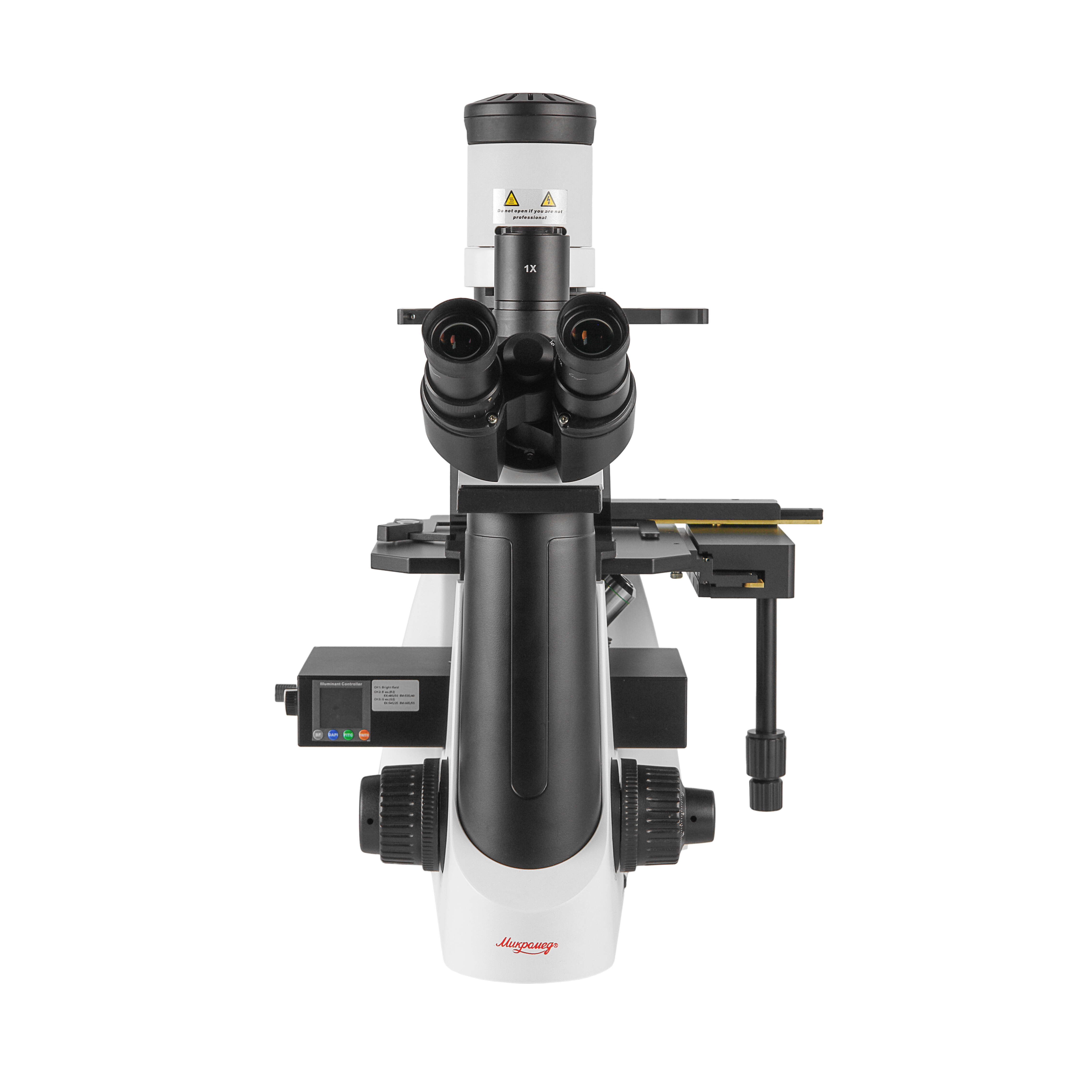 - Инвертированный штатив со встроенным в основание блоком питания, неподвижным предметным столиком, осветителем проходящего света и механизмом фокусировки