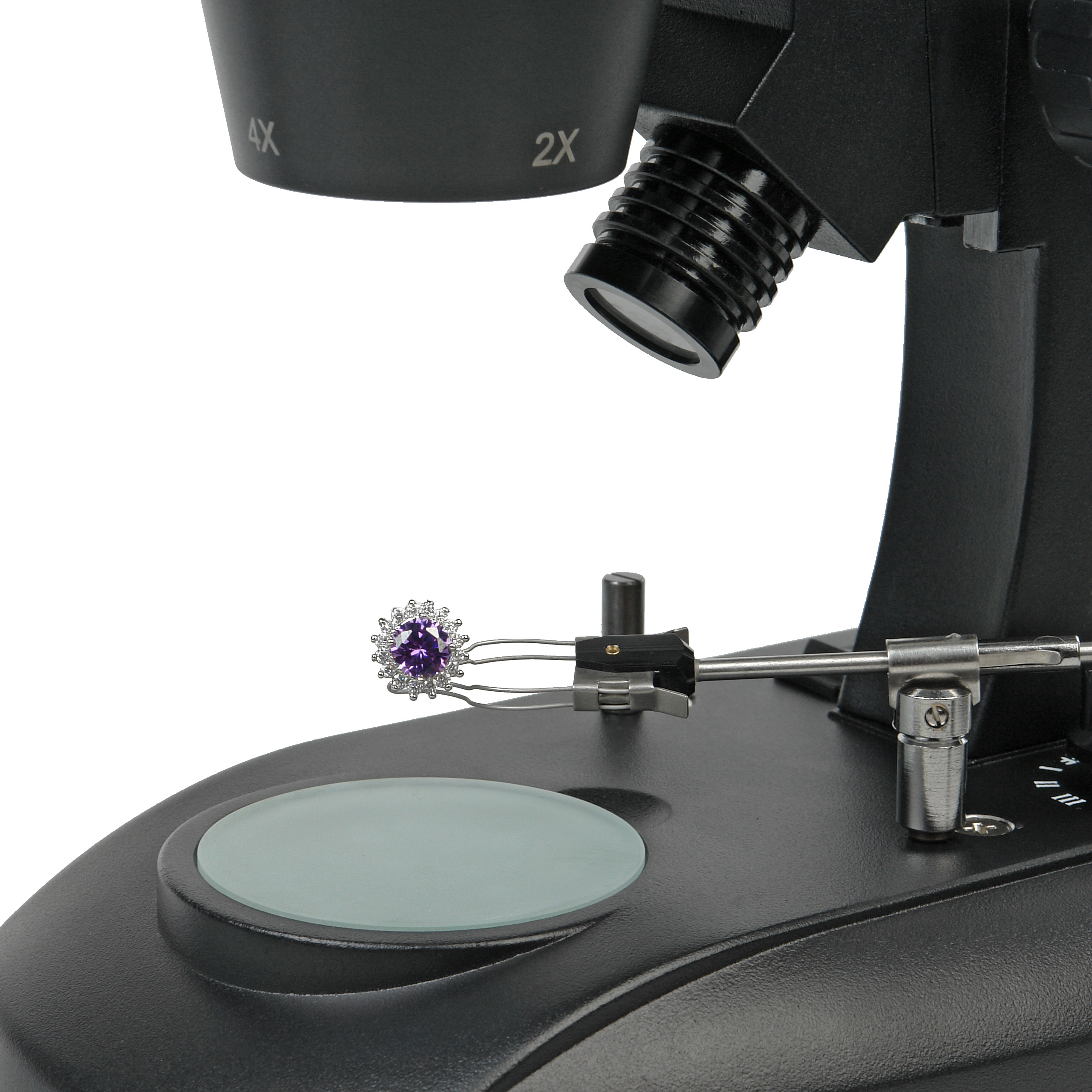 Исследования в проходящем свете проводятся с помощью осветителя на галогенной лампе 10 Вт / 12 В. Осветитель встроен в основание микроскопа. Основание оборудовано съемным ювелирным пинцетом.