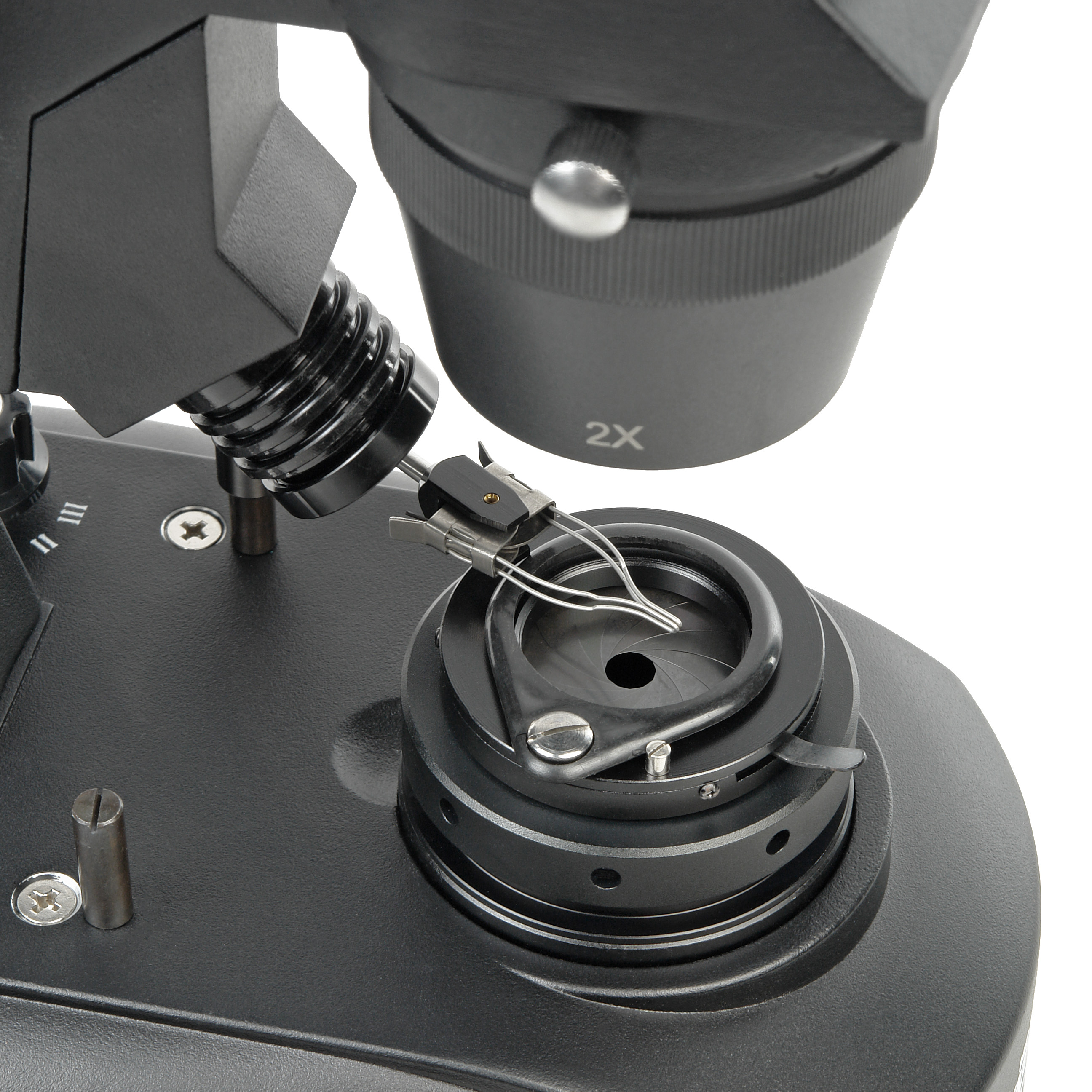 Конденсор темного поля входит в комплект микроскопа. С его помощью можно методом светлого поля исследовать объекты, имеющие малый контраст и поэтому плохо визуализируемые при обычных методах исследований в проходящем свете, например, прозрачные кристаллы, изделия из стекла и полимеров. Конденсор имеет встроенную апертурную ирисовую диафрагму для настройки освещения. Конструкция осветителя позволяет устанавливать комплектные вставки – полупрозрачную для работы в проходящем свете или двухстороннюю черную/белую для исследований в отраженном свете.