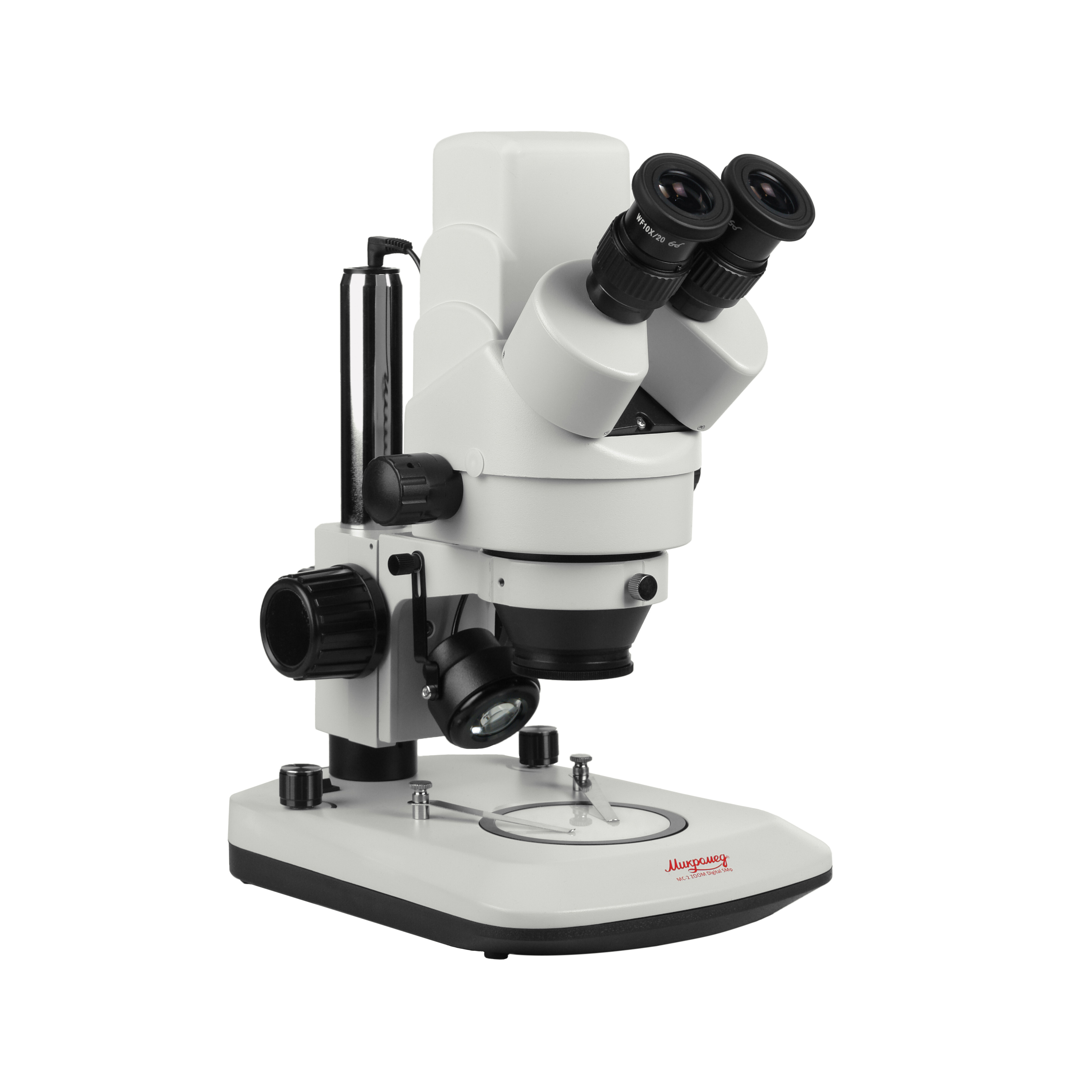 Объективы микроскопа имеют переменное увеличение, плавно изменяемое от 0.7х до 4.5х. Микроскоп имеет оптическую схему Грену – для наблюдения стереоскопического трехмерного изображения используется пара одинаковых объективов, установленных под углом к плоскости исследуемого объекта. Высокое качество изображения определяется точно рассчитанными и изготовленными объективами. Благодаря их оптической конструкции с исправленными аберрациями достигается высокая резкость и яркость изображения во всем диапазоне увеличений. Конструкция объективов позволяет сохранять точную фокусировку микроскопа вне зависимости от установленного значения увеличения.
