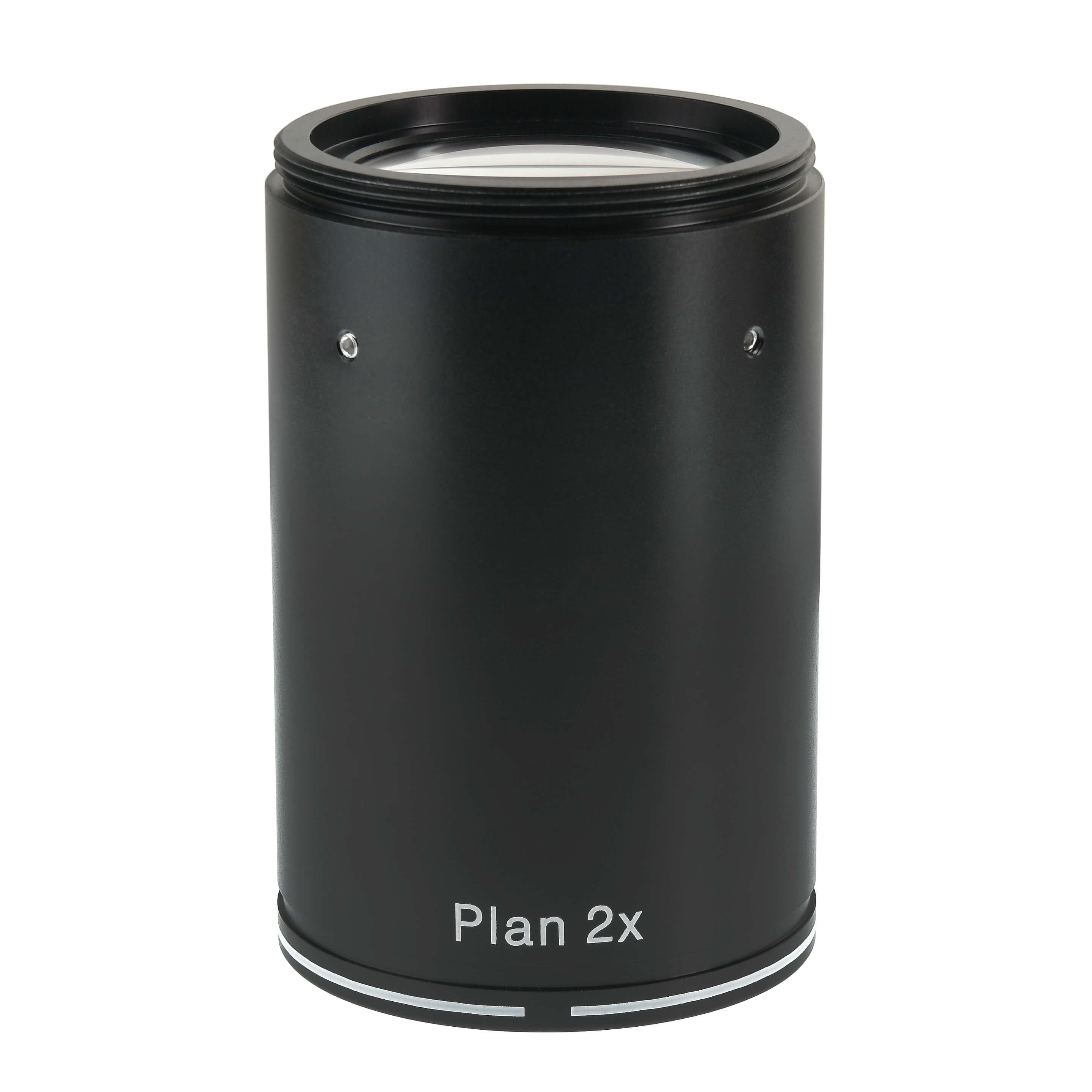 Объектив Plan 2x имеет большой диаметр для обеспечения стереоскопичности, создаваемой углом 12⁰ между лучами, проходящими через периферические участки линз. Благодаря исправленным хроматическим аберрациям, кривизне поля и сферической аберрации объектив создает плоское изображение с высоким разрешением без потерь информативности на краях поля.