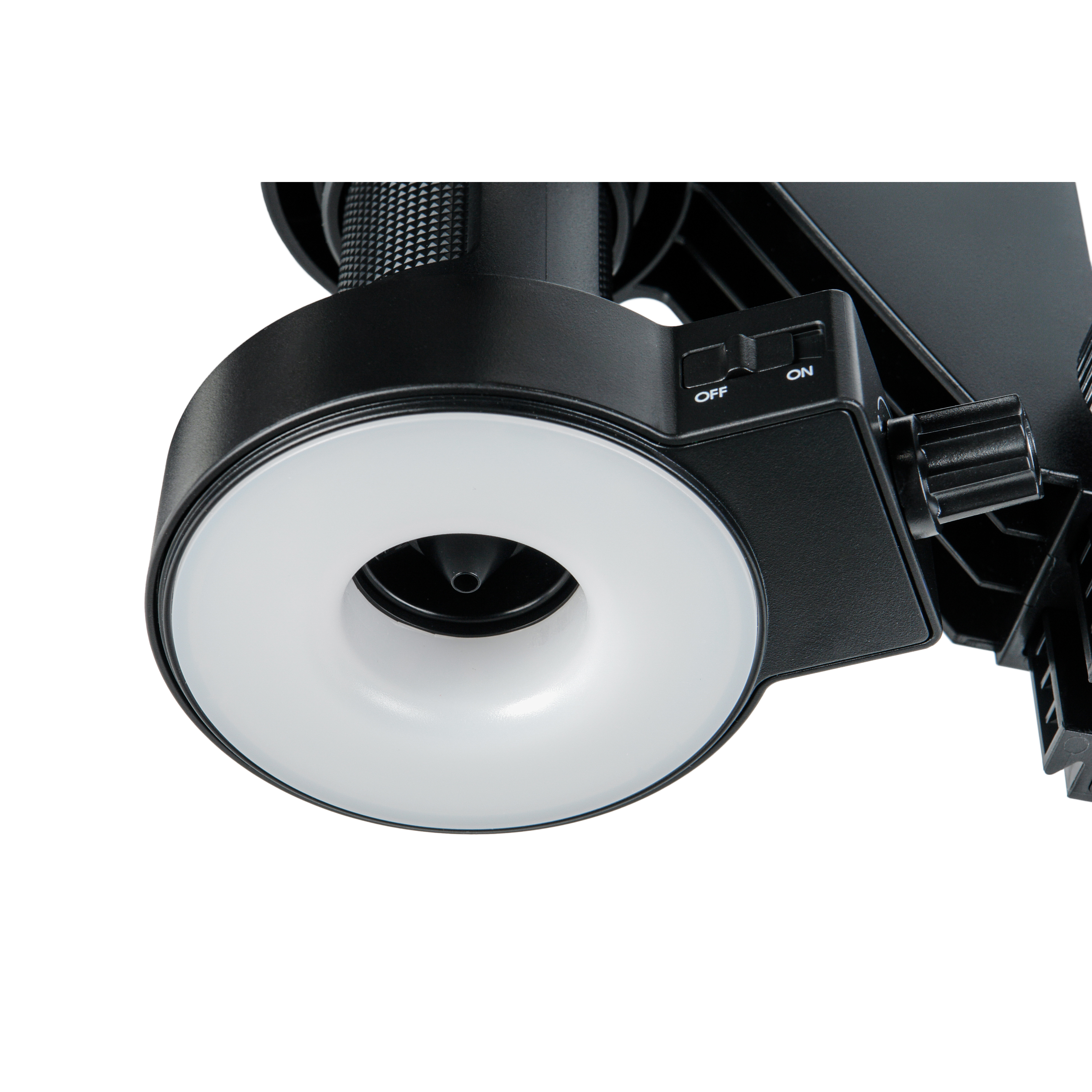 Кольцевой осветитель микроскопа позволяет исследовать непрозрачные и полупрозрачные объекты в отраженном свете. В осветителе используется 30 светодиодов со спектром излучения близким к дневному свету. Подобный свет способствует правильной цветопередаче и точной автоматической настройке WB. Светодиоды расположены по кольцу вокруг объектива и благодаря такой конфигурации достигается равномерное освещение объекта без ассиметричных косых теней препятствующих проведению точных измерений размеров объекта и получению ложных результатов исследований. Осветитель имеет бесступенчатую регулировку яркости, она производится рукояткой на корпусе осветителя. Питание светодиодов, также, как камеры и монитора, осуществляется от встроенного аккумулятора. Осветитель оснащен защитным рассеивающим стеклом, повышающим равномерность освещения.