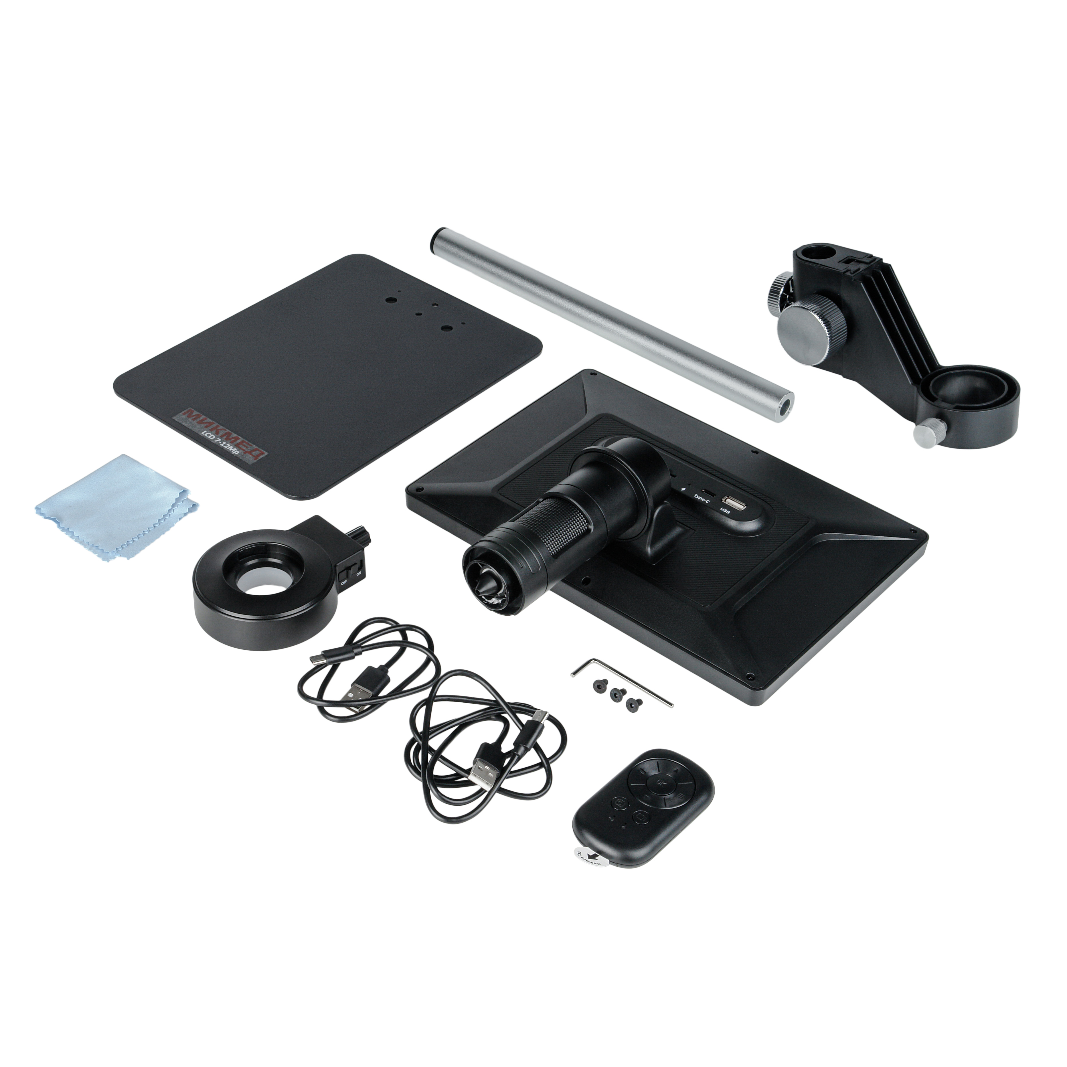 Микроскоп состоит из оптической головки с LCD монитором на кронштейне, осветителя и штатива с основанием. В состав микроскопа ходит устройство визуализации на основе 12Мр камеры, передающей видеоряд с разрешением Full HD - 1920х1080 и файлы формата фото с разрешением до 4032х3024. В устройство входит монитор 7” на IPS матрице. Это позволяет в режиме реального времени наблюдать изображения высокого разрешения на мониторе и проводить исследования при групповых занятиях. Питание монитора, камеры и осветителя осуществляется от встроенного в микроскоп литий-ионного аккумулятора емкостью 3000 мАч.