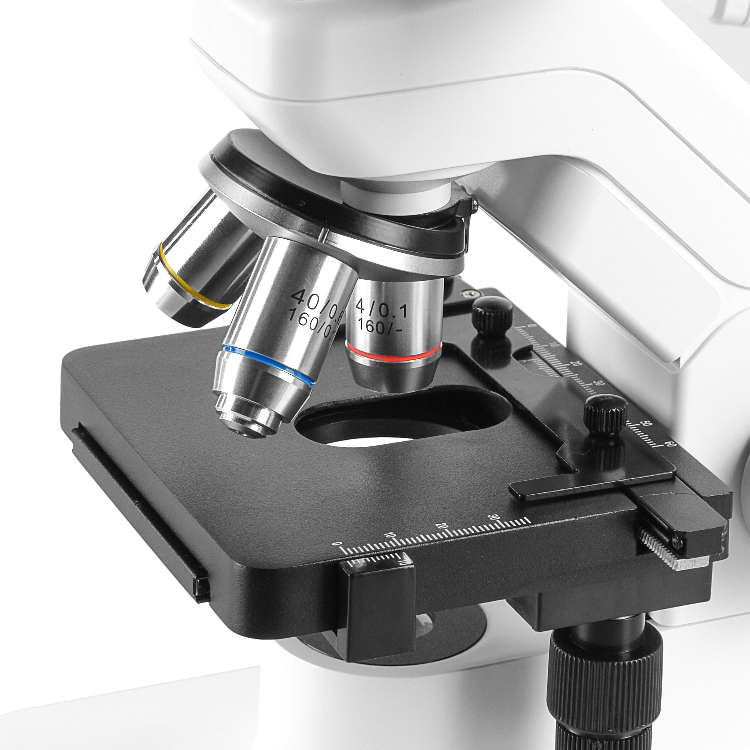 В комплекте микроскопа три объектива с линзами из оптических стекол 4х, 10х и 40х позволяющие получать резкое изображение с правильной цветопередачей и минимальными искажениями. Объектив 40х имеет подпружиненную оправу для предотвращения повреждения объектива и образца при фокусировке.