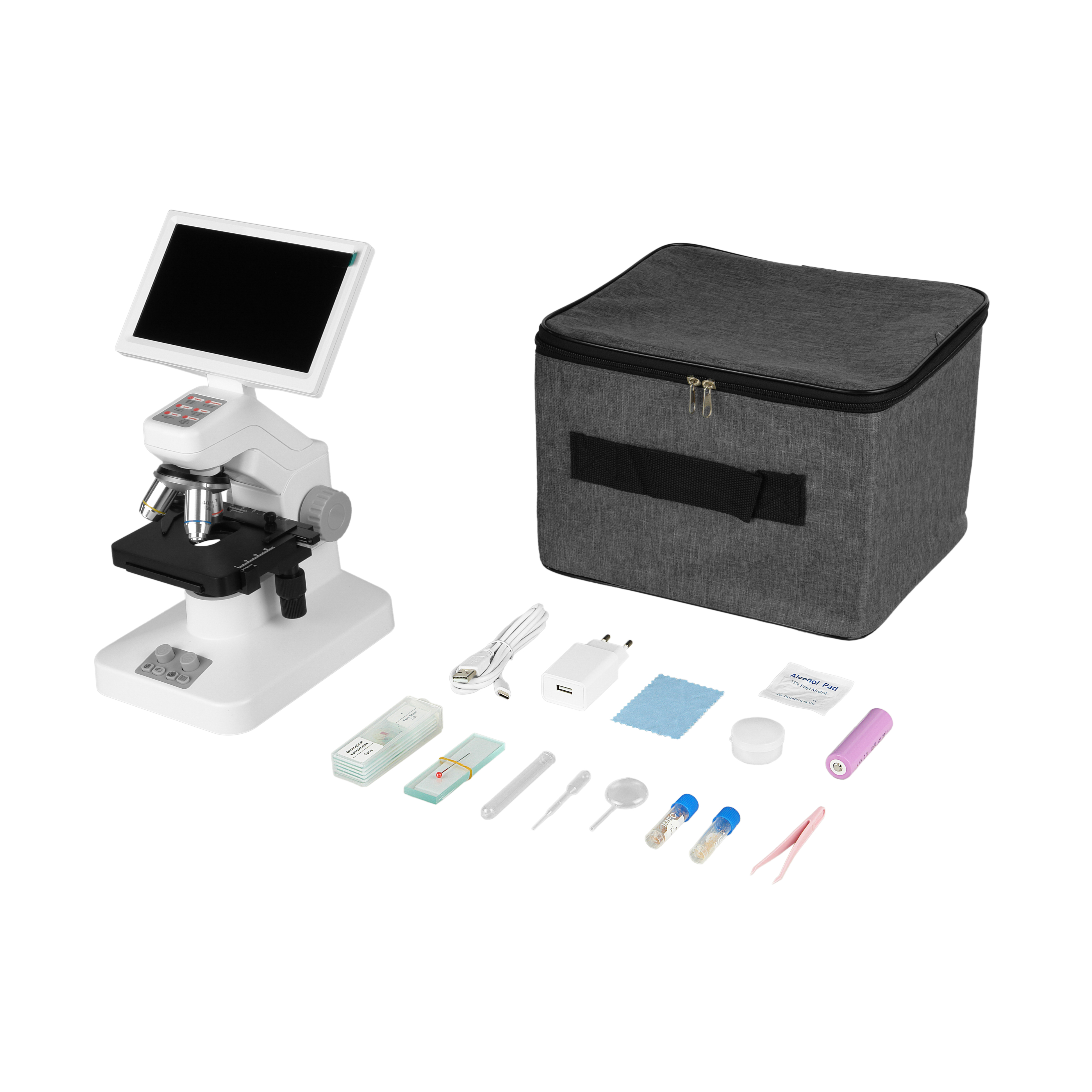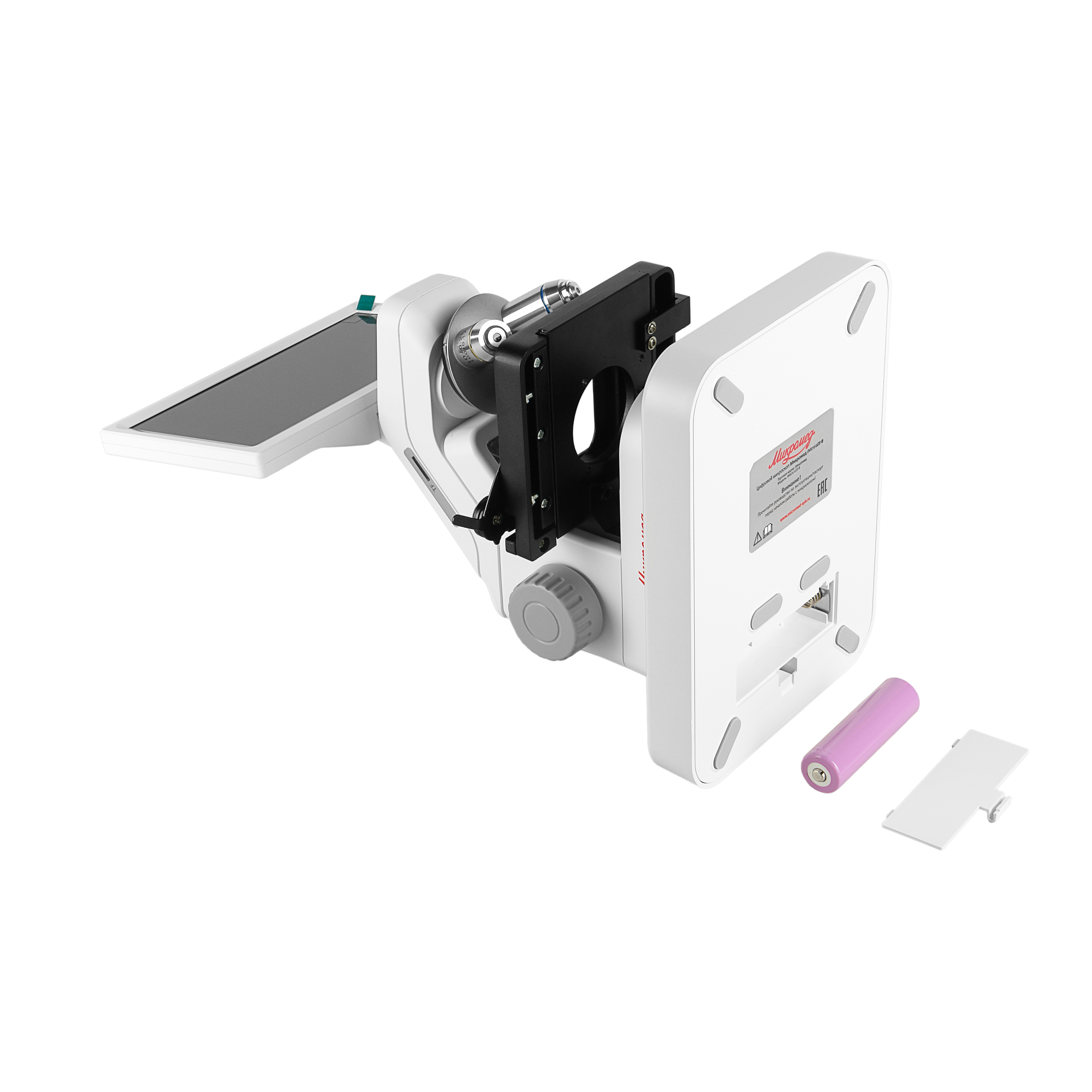 Микроскоп состоит из оптической головки с объективами на револьверном устройстве, светодиодными осветителями проходящего и отраженного света, механизмом фокусировки и LED монитором 7”. На штативе микроскопа установлен механический предметный столик. Все, что требуется сделать после приобретения, это распаковать микроскоп и можно начинать исследования.