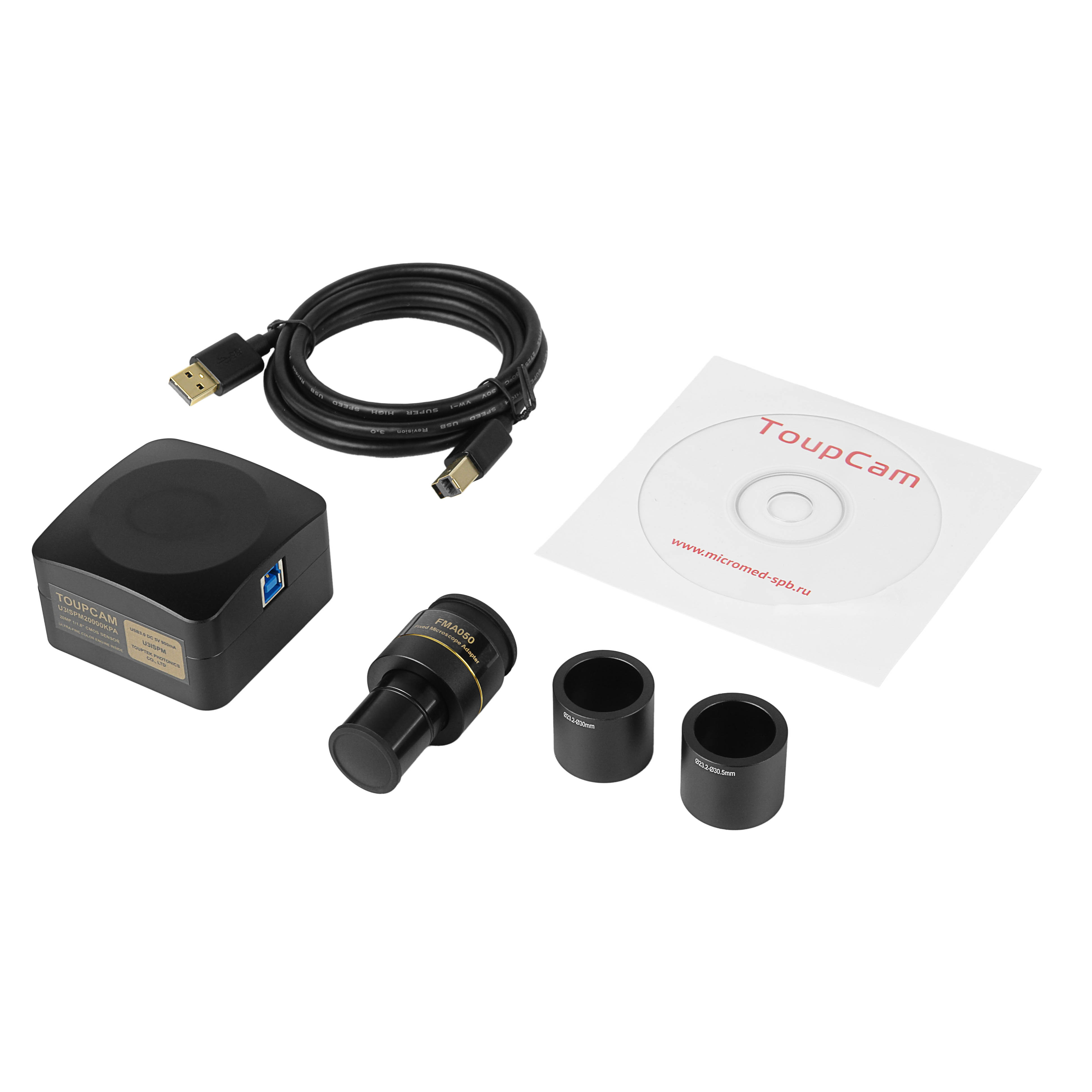 В комплект к камере входят переходники 23.2/30.0 и 23.2/30.5, благодаря этому не возникнет никаких трудностей при установке камеры на микроскопы плоского поля и стереомикроскопы с тубусами различных диаметров. Посредством комплектного адаптера 0.5х камера устанавливается на микроскопы с тубусом 23.2 мм.